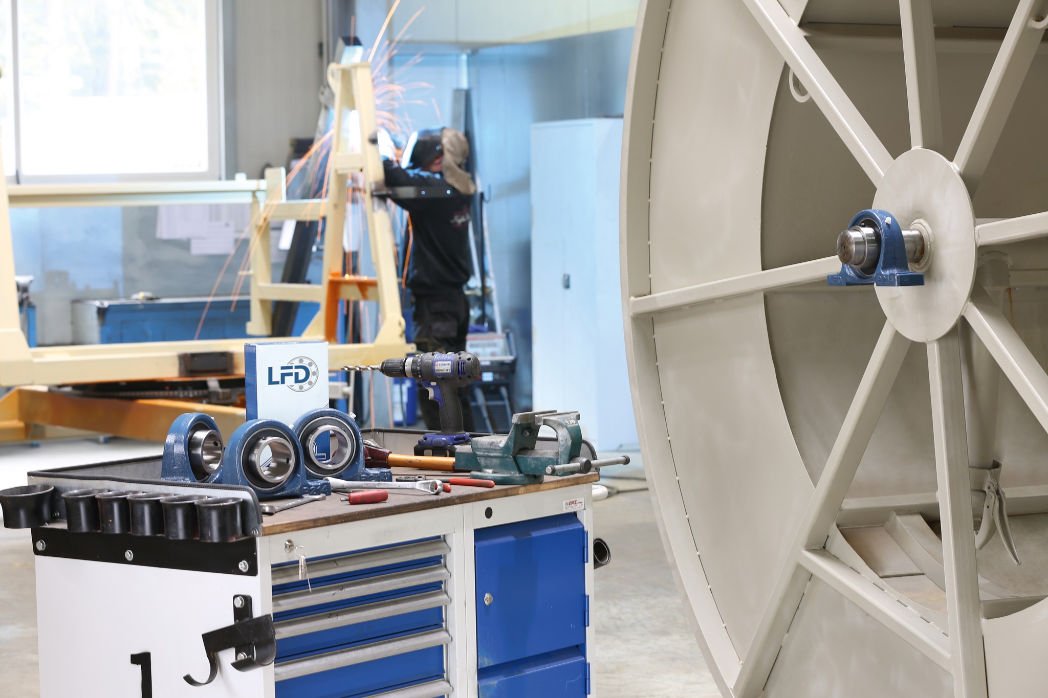 Die rotierende Stahltrommel besitzt eine Edelstahlachse, die in einem flankierend angebrachten LFD-Stehlagern endet. An dieser Stelle lagert das Gewicht der schweren Stahltrommel und genau dort werden die hohen Zugkräfte beim Einzug der am Boden reibenden Rohre aufgefangen. Auf Robustheit ausgelegt sind auch die Dreifach-Rollenführungen des Spulwagens, weil beim Aufspulen des Rohres enorme Seitenkräfte entstehen. Es muss über die gesamte Breite der Trommel exakt aufgewickelt werden, was extrem schwierig ist, wenn es seitlich in der Fahrspur abgelegt wurde. In der Buchse des Spulwagens sind Rillenkugellager von LFD verbaut. Sie unterstützen die Funktion des Führungsbolzens, der der Nut der Spindelwelle folgt. Die Spindelwelle wiederum ist beidseitig mit funktionsgenau angepassten LFD-Flanschlagern gelagert, damit ein störungsfreier Betrieb gewährleistet ist.