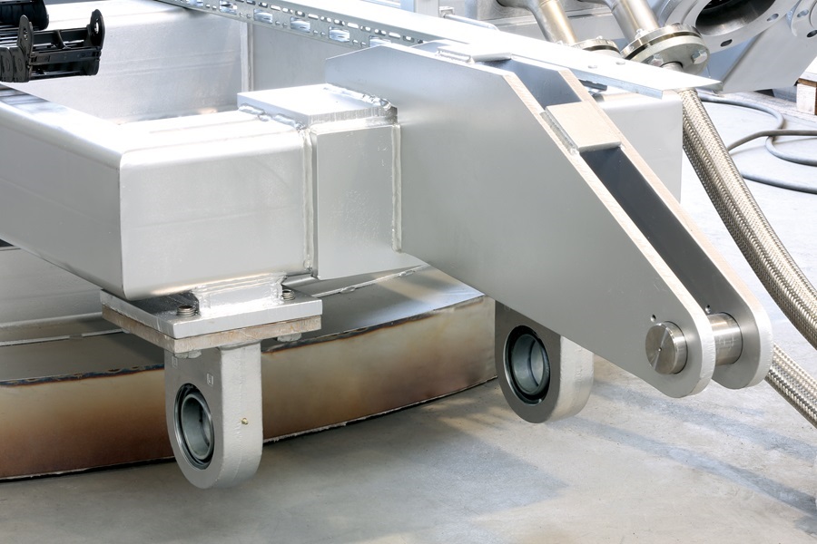 Bei dem großen Brenner sind Gelenklagerköpfe an den Hydraulikzylindern installiert, aber zusätzlich auch fest verbaut. Zum einen muss der Arm sicher geführt werden, wofür zwei Lager im Einsatz sind, die leichte Fluchtungsfehler ausgleichen. Gleichzeitig müssen sie aber auch eigentlich die ganze Last aufnehmen. Zum anderen gibt es Gelenkköpfe an den Hydraulikzylindern, um beispielsweise keine Querkräfte auf die Kolbenstangen oder die Dichtungen wirken zu lassen. Dadurch würde die Konstruktion einerseits schwergängiger und auf Dauer würde es zu einem erhöhten Verschleiß am Zylinder und an den Lagerungen kommen.